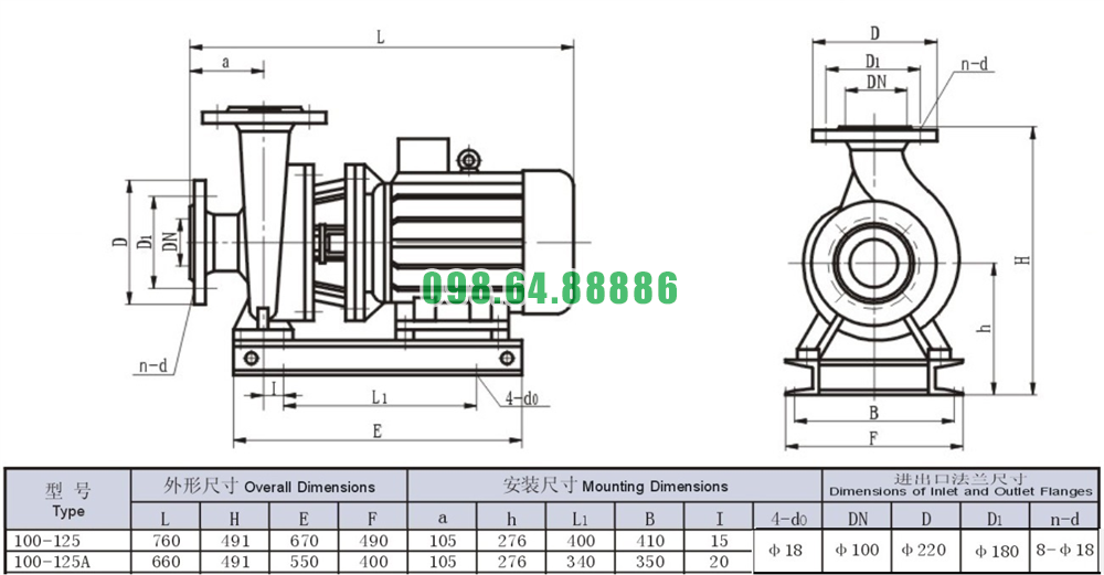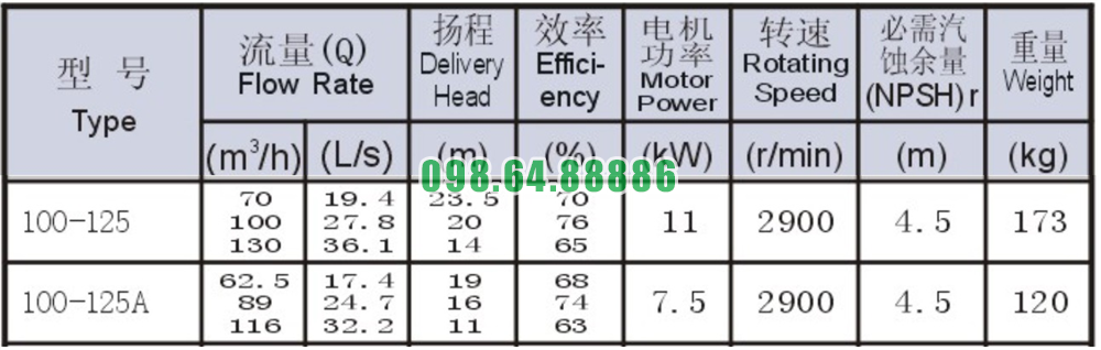 Bảng thông số kỹ thuật bơm nước trục ngang SLW100-ISW100-125