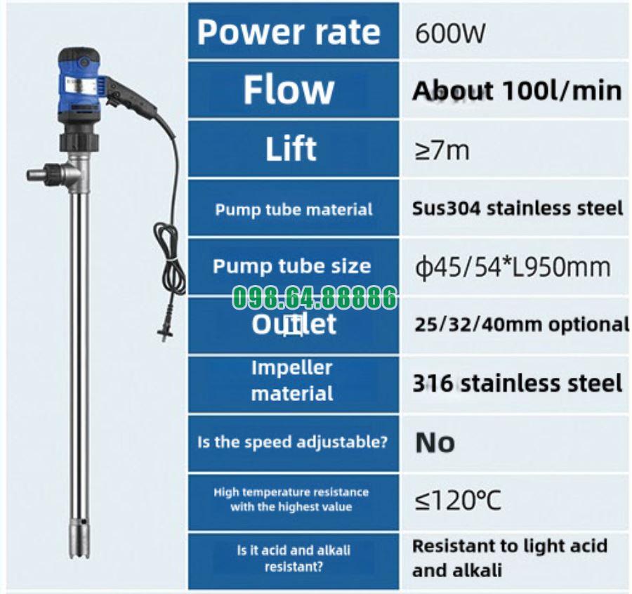 Bơm hút thùng phuy JDT-G120-600W sử dụng motor điện 600W, tạo ra tốc độ quay mạnh mẽ và ổn định. Khi motor hoạt động, năng lượng được truyền xuống trục bơm thông qua khớp nối. Thiết kế khớp nối chính xác giúp giảm rung, đảm bảo trục quay đều, không đảo trục và hạn chế mài mòn linh kiện.