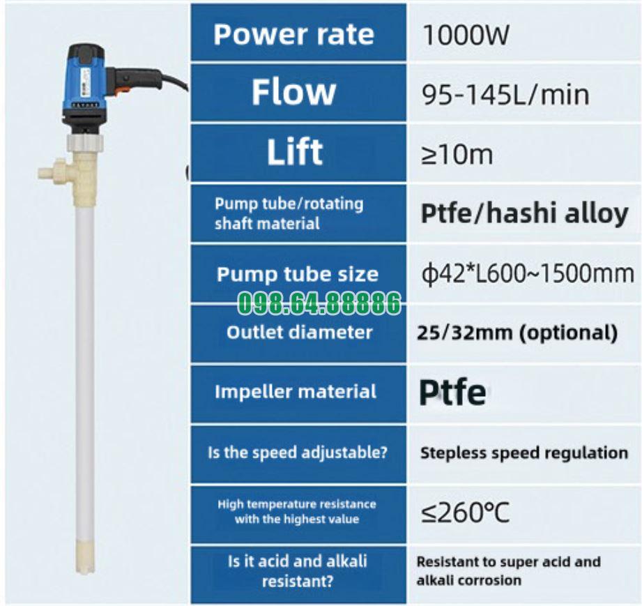 Bơm điện nhúng thùng phuy hóa chất chịu axit - kiềm model JDT-1000W-PTFE