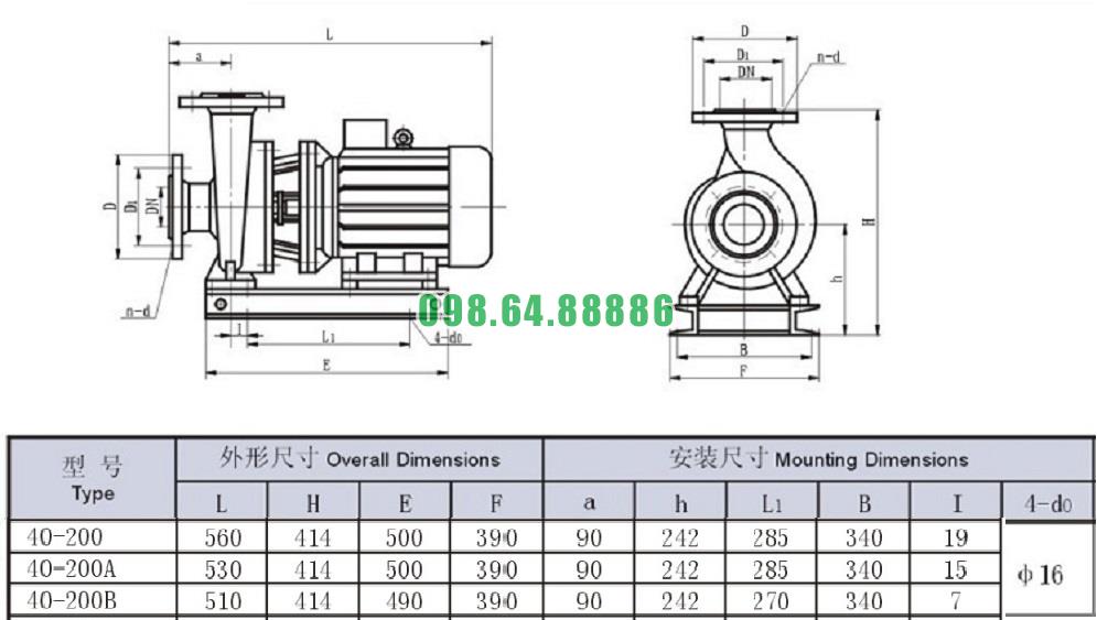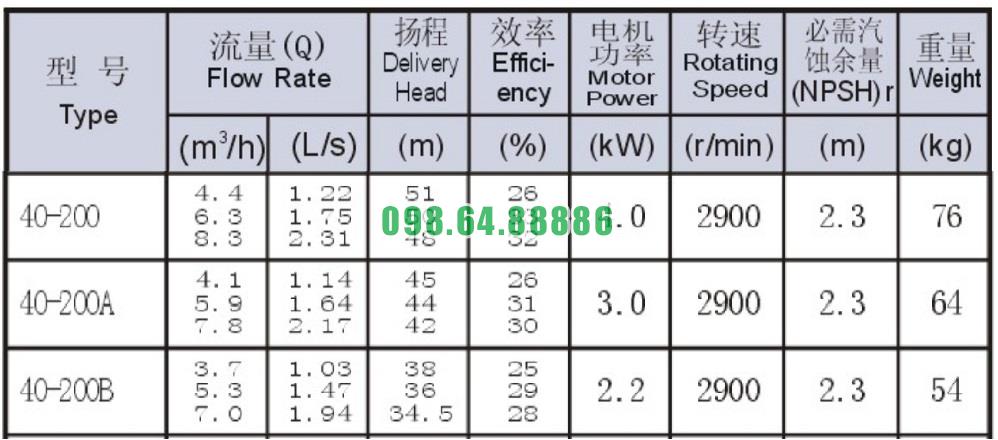 Bơm li tâm trục ngang SLW-ISW40-200 đẩy cao 51m và hút sâu 2.3m