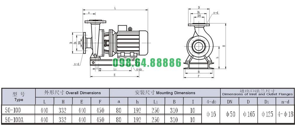 Bản vẽ cấu tạo và kích thước bơm li tâm trục ngang SLW-ISW50-100 có động cơ 1.1 kw đẩy cao 13.6m