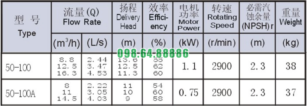 Bảng thông số kỹ thuật bơm li tâm trục ngang SLW-ISW50-100 có động cơ 1.1 kw đẩy cao 13.6m