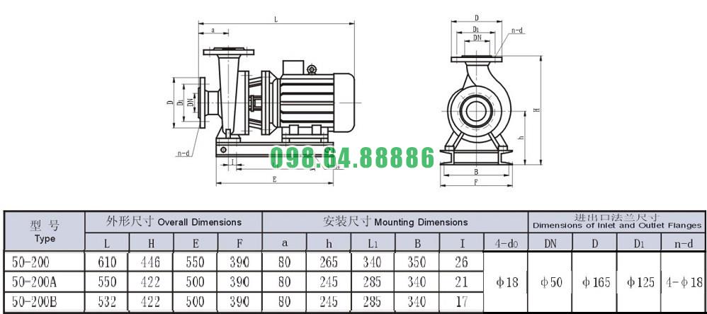 Bản vẽ cấu tạo và kích thước bơm li tâm trục ngang SLW-ISW50-200 động cơ 5.5 kw năng suất 46%