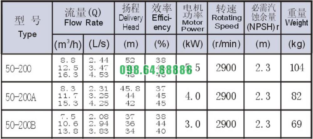 Bảng thông số kỹ thuật bơm li tâm trục ngang SLW-ISW50-200 động cơ 5.5 kw năng suất 46%