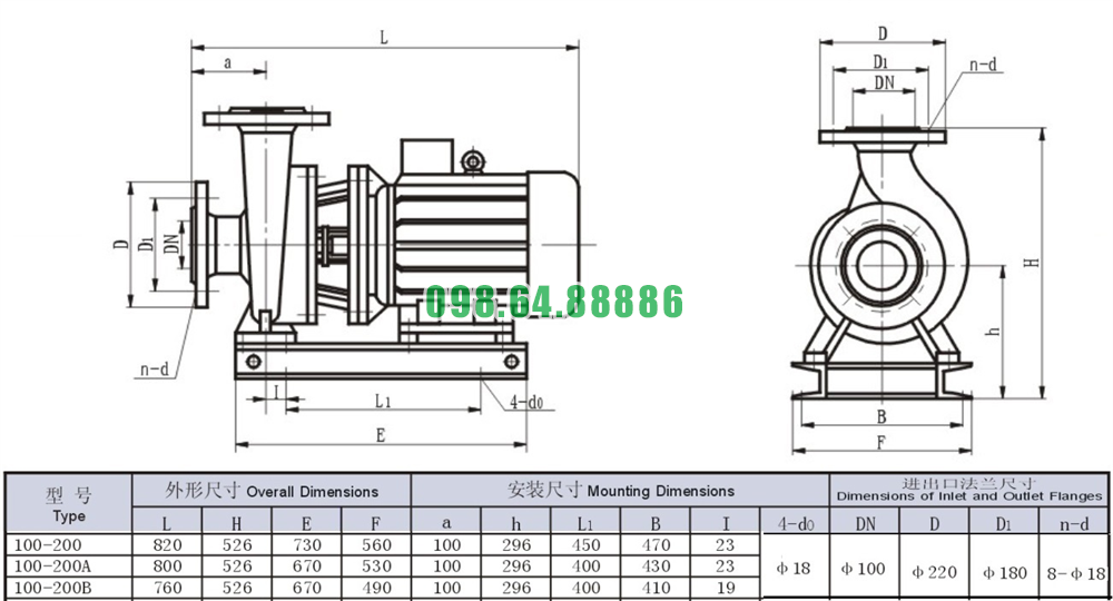 Bản vẽ cấu tạo và kích thước bơm li tâm trục ngang SLW100-ISW100-200 động cơ 22 kw năng suất 75%