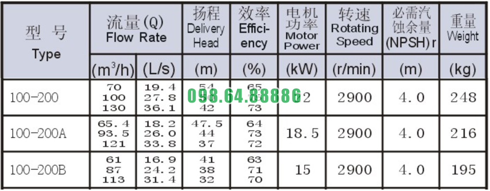 Bảng thông số kỹ thuật bơm li tâm trục ngang SLW100-ISW100-200 động cơ 22 kw năng suất 75%