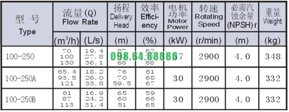 Bảng thông số kỹ thuật bơm li tâm trục ngang SLW100-ISW100-250 động cơ 37 kw năng suất 71%