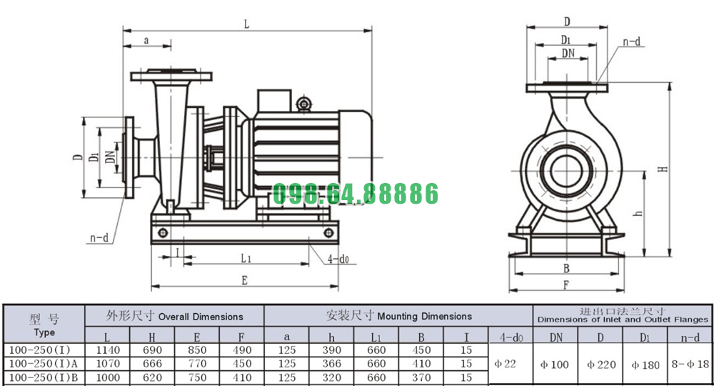 Bản vẽ cấu tạo và kích thước bơm li tâm trục ngang SLW100-ISW100-250-I động cơ 55 kw năng suất 77%