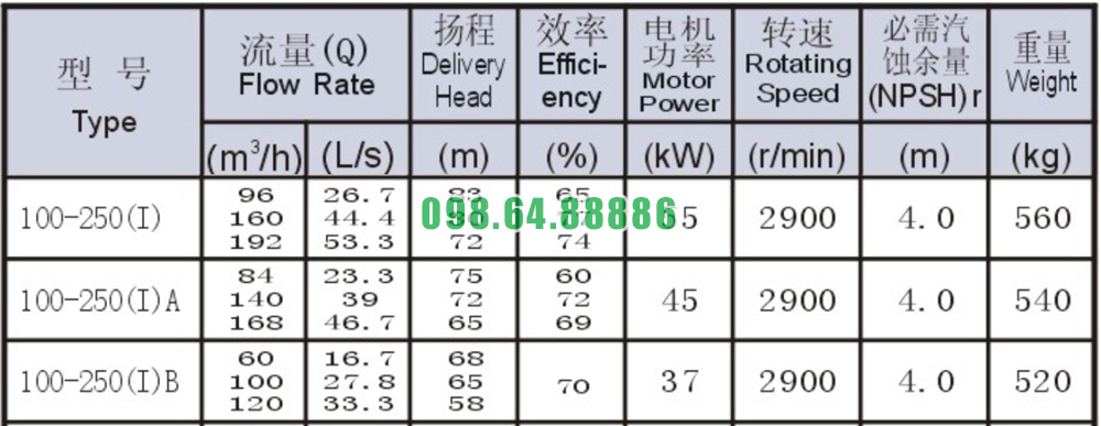 Bảng thông số kỹ thuật bơm li tâm trục ngang SLW100-ISW100-250-I động cơ 55 kw năng suất 77%