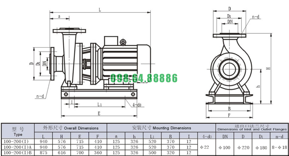 Bản vẽ cấu tạo và kích thước bơm li tâm trục ngang SLW100-ISW100-200-I có động cơ 37 kw đẩy cao 54m