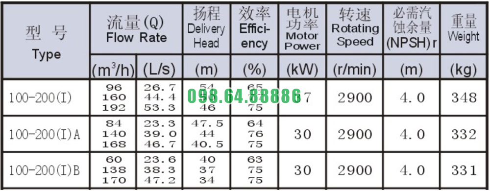 Bảng thông số kỹ thuật bơm li tâm trục ngang SLW100-ISW100-200-I có động cơ 37 kw đẩy cao 54m