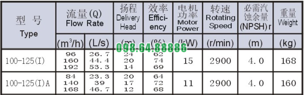 Bảng thông số kỹ thuật bơm li tâm trục ngang SLW100-ISW100-125-I động cơ 15 kw năng suất 74%