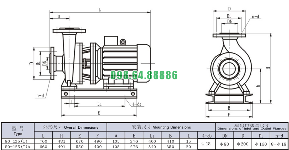Bản vẽ cấu tạo và kích thước bơm li tâm trục ngang SLW80-ISW80-125-I động cơ 11 kw năng suất 76%