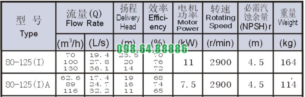 Bảng thông số kỹ thuật bơm li tâm trục ngang SLW80-ISW80-125-I động cơ 11 kw năng suất 76%