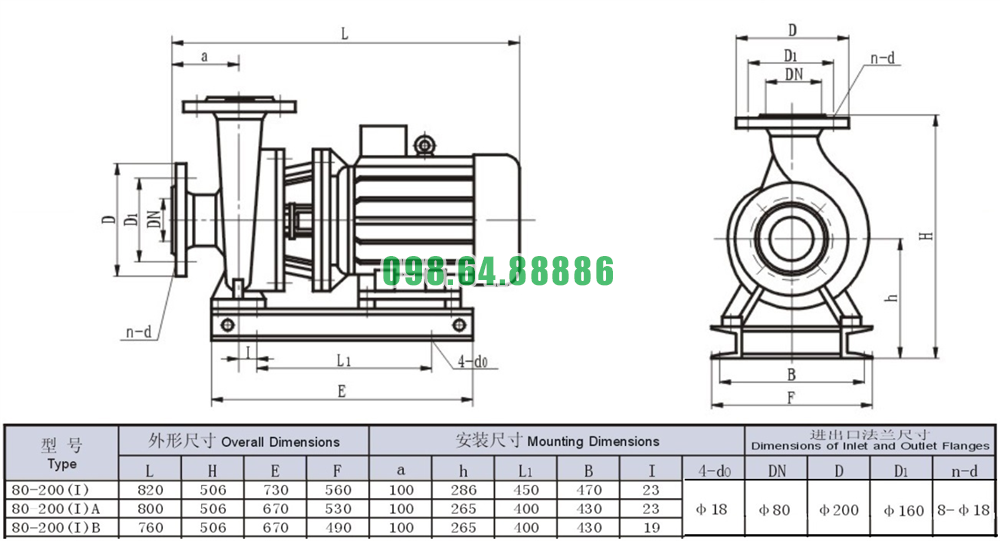 Bản vẽ cấu tạo và kích thước bơm li tâm trục ngang SLW80-ISW80-200-I động cơ 11 kw năng suất 74%