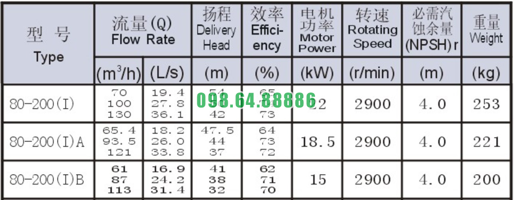 Bảng thông số kỹ thuật bơm li tâm trục ngang SLW80-ISW80-200-I động cơ 11 kw năng suất 74%