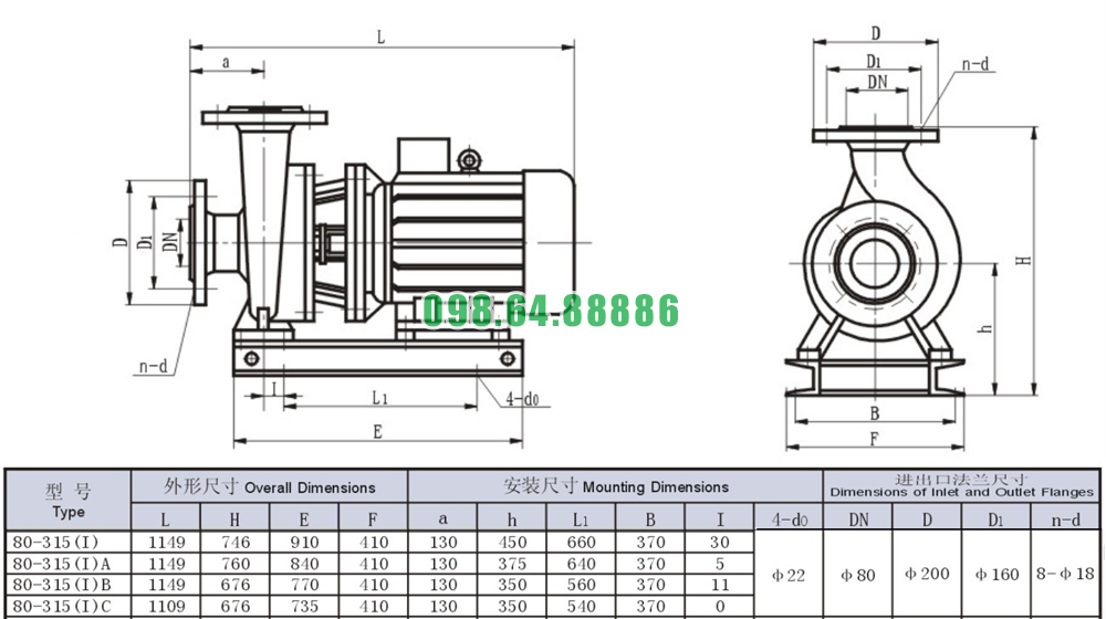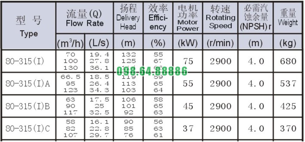 Bơm li tâm trục ngang SLW80-ISW80-315-I động cơ 11 kw năng suất 67%