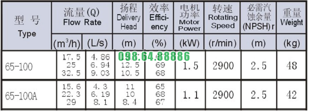 Bảng thông số kỹ thuật bơm nước li tâm trục ngang công suất 32.5 m3/h model SLW-ISW65-100