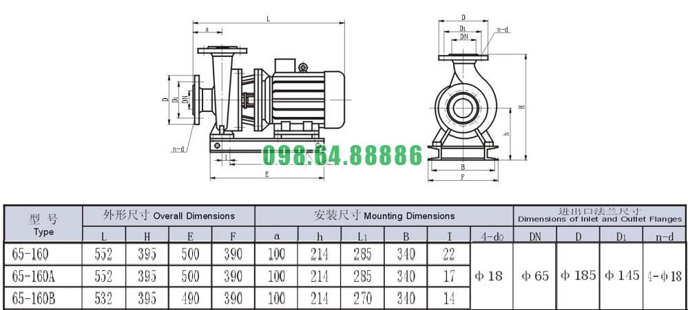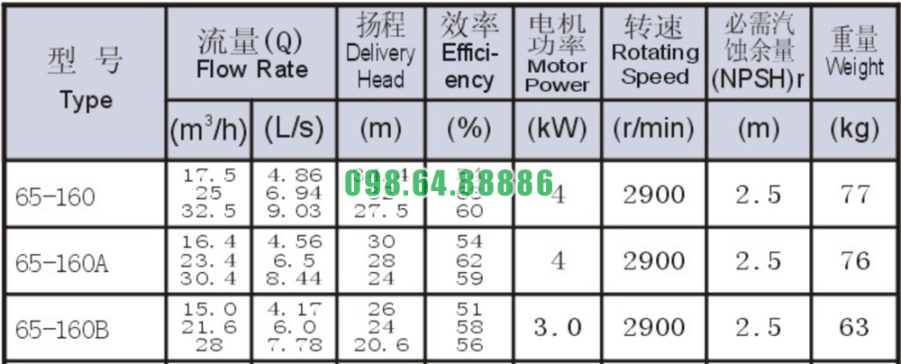 Bảng thông số kỹ thuật bơm nước li tâm trục ngang công suất 32.5 m3/h model SLW-ISW65-160