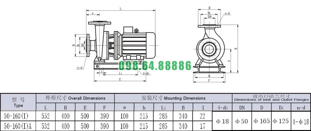 Bản vẽ cấu tạo và kích thước bơm nước li tâm trục ngang mode SLW-ISW50-160-I động cơ 4 kw công suất 9.03 L/s