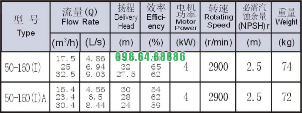 Bảng thông số kỹ thuật bơm nước li tâm trục ngang mode SLW-ISW50-160-I động cơ 4 kw công suất 9.03 L/s