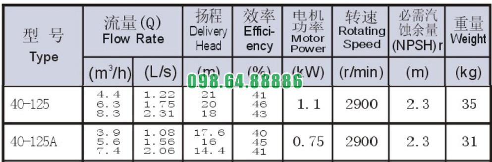 Bảng thông số kỹ thuật bơm nước li tâm trục ngang SLW-ISW40-125 động cơ 1.1 kw lưu lượng max 8.3 m3/h