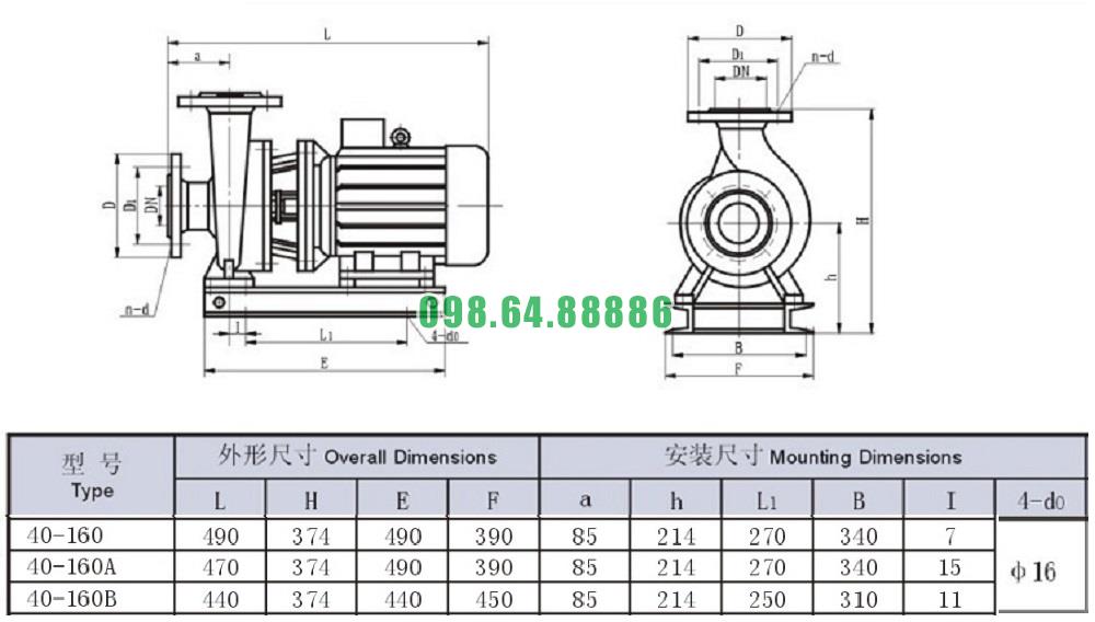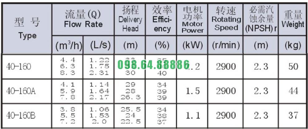 Bảng thông số kỹ thuật bơm nước nằm ngang SLW-ISW40-160 hiệu suất 4.4 m3/h - 8.3 m3/h