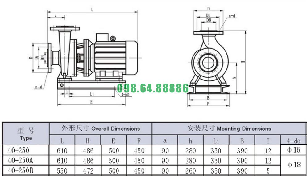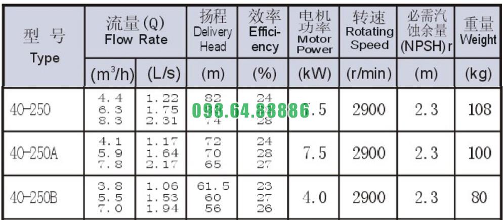 Bảng thông số kỹ thuật bơm nước trục ngang SLW-ISW40-250
