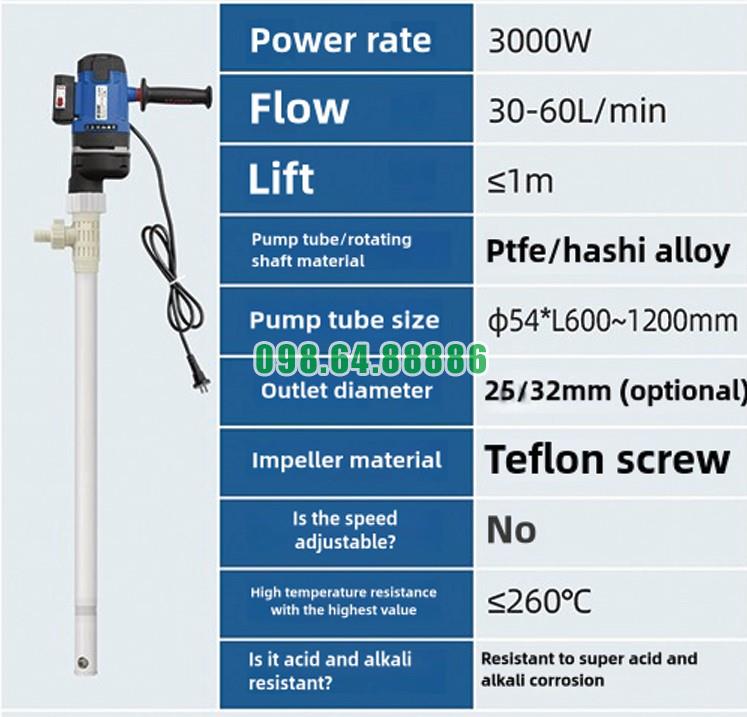 Bơm trục vít cầm tay hút thùng phuy JDT-3000W-PTFELG sở hữu công suất mạnh mẽ lên đến 3000W