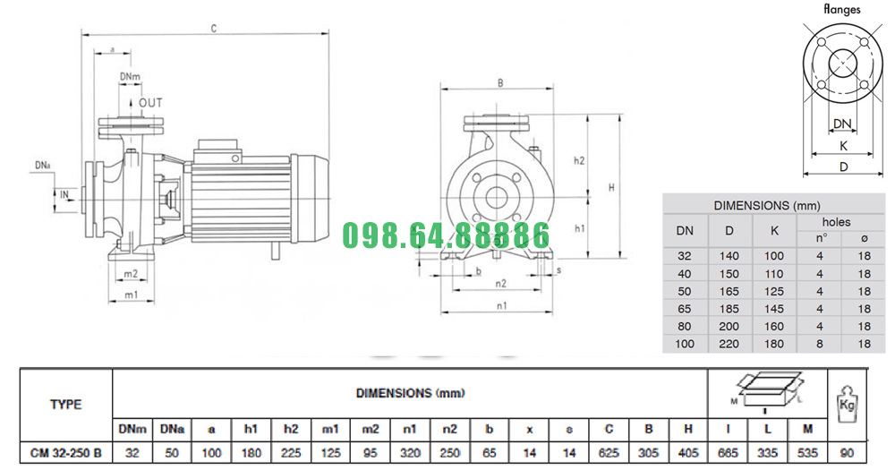 Kích thước máy bơm nước li tâm trục ngang CM32-250B
