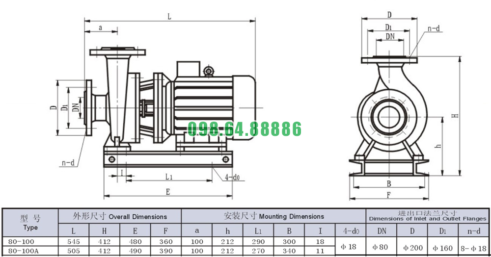 Bản vẽ cấu tạo và kích thước bơm nước trục ngang model SLW80-ISW80-100 công suất 3 kw đẩy cao 13.8m