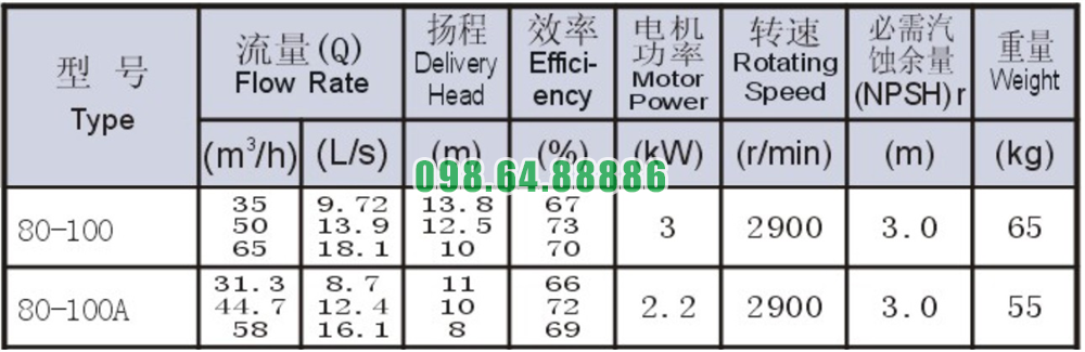 Bảng thông số kỹ thuật bơm nước trục ngang model SLW80-ISW80-100 công suất 3 kw đẩy cao 13.8m