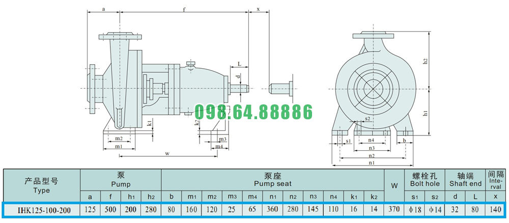 Kích thước của đầu máy bơm nước sạch li tâm cánh hở IHK125-100-250