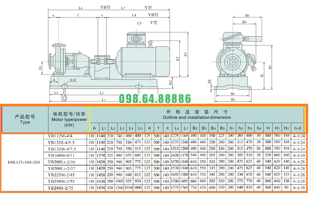 Kích thước lắp đặt của máy bơm nước sạch li tâm cánh hở IHK125-100-250