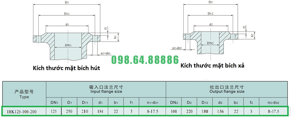Kích thước mặt bích của máy bơm nước sạch li tâm cánh hở IHK125-100-250