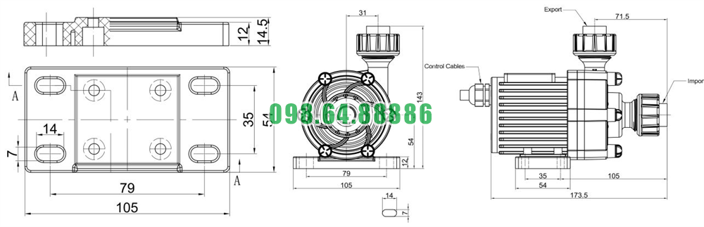 Hình ảnh cấu tạo và kích thước bản vẽ chi tiết bơm hóa chất điện 48v
