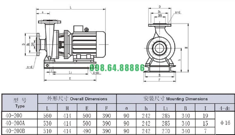 Bản vẽ cấu tạo và kích thước bơm nước trục ngang SLW-ISW40-200-I độngg cơ 5.5 kw lưu lượng 16.3 m3/h