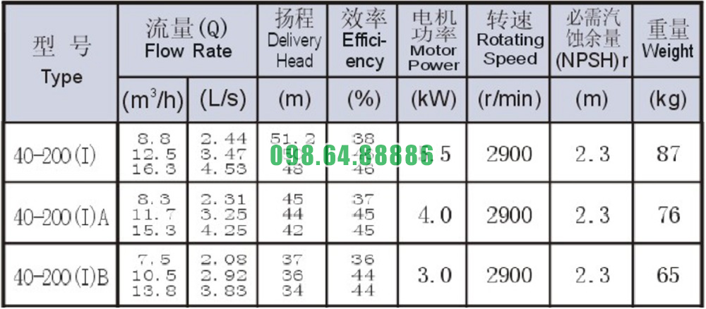 Bảng thông số kỹ thuật bơm nước trục ngang SLW-ISW40-200-I độngg cơ 5.5 kw lưu lượng 16.3 m3/h