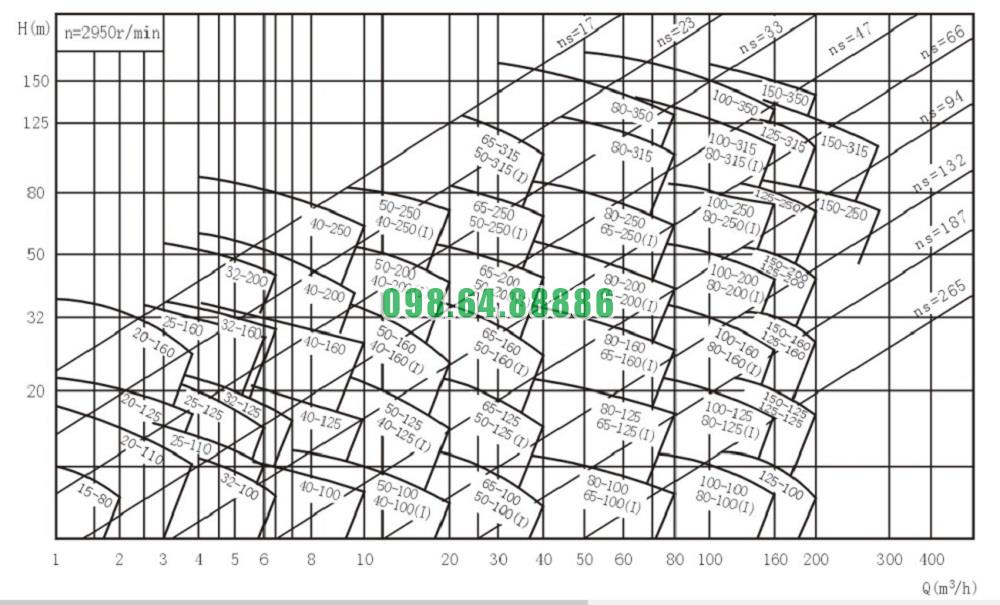 Đường cong hiệu suất bơm nước trục ngang SLW-ISW40-200-I độngg cơ 5.5 kw lưu lượng 16.3 m3/h