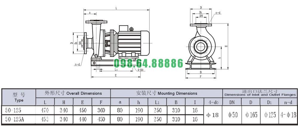 Bản vẽ cấu tạo và kích thước bơm nước trục ngang SLW-ISW50-125 động cơ 1.5 kw lưu lượng 16.3 m3/h
