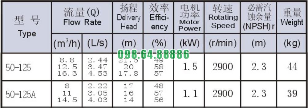 Bảng thông số kỹ thuật bơm nước trục ngang SLW-ISW50-125 động cơ 1.5 kw lưu lượng 16.3 m3/h