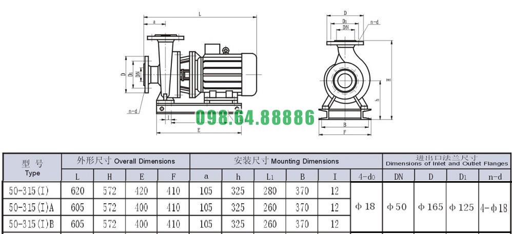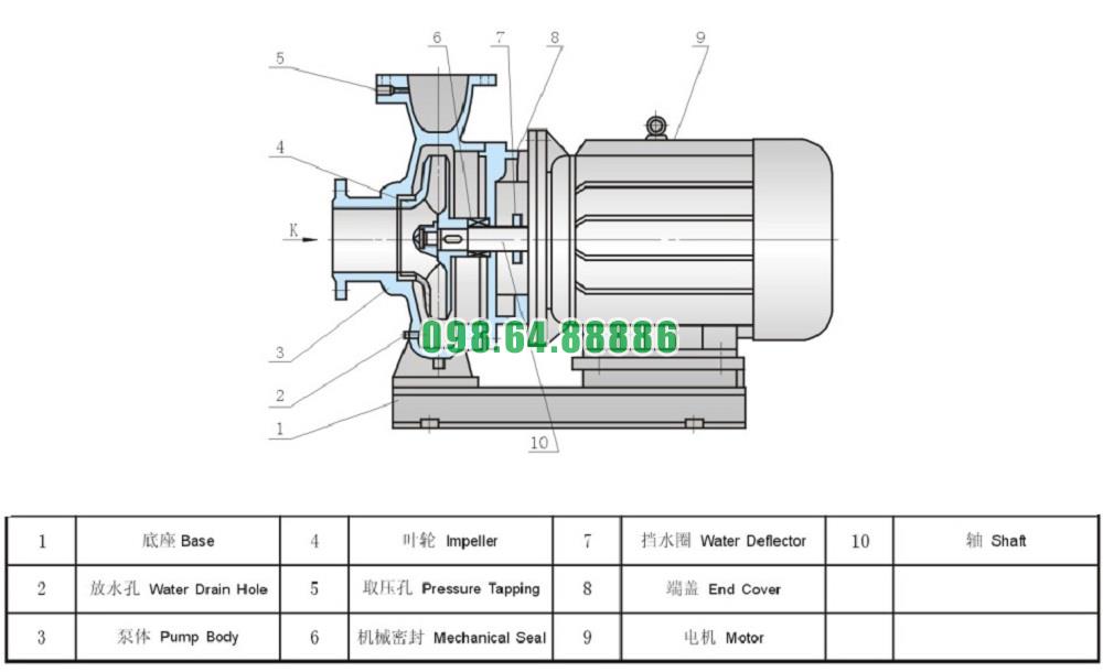 Bản vẽ cấu tạo và kích thước bơm li tâm trục ngang SLW-ISW50-315-I động cơ 30 kw năng suất 38%