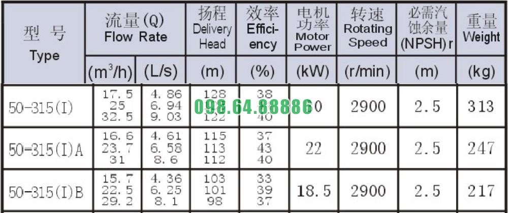 Bảng thông số kỹ thuật bơm li tâm trục ngang SLW-ISW50-315-I động cơ 30 kw năng suất 38%