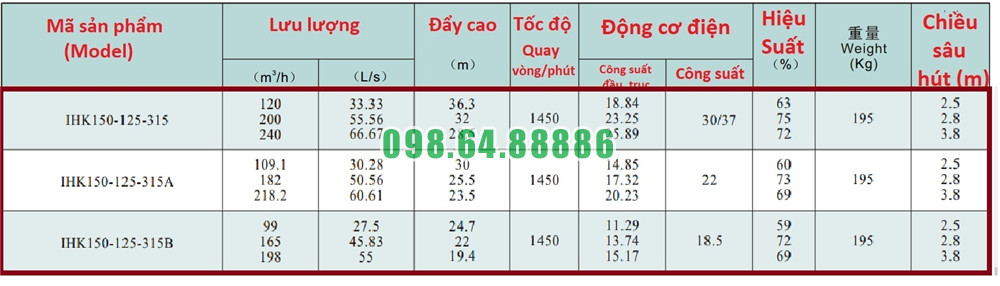 Bảng lưu lượng của máy bơm nước li tâm trục ngang cánh hở IHK150-125-315