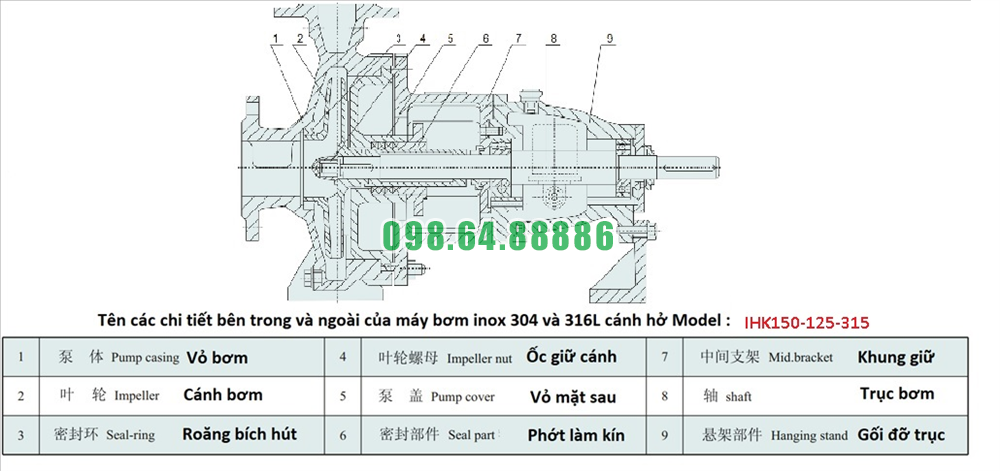 Cấu táo chung của máy bơm nước li tâm trục ngang cánh hở IHK150-125-315
