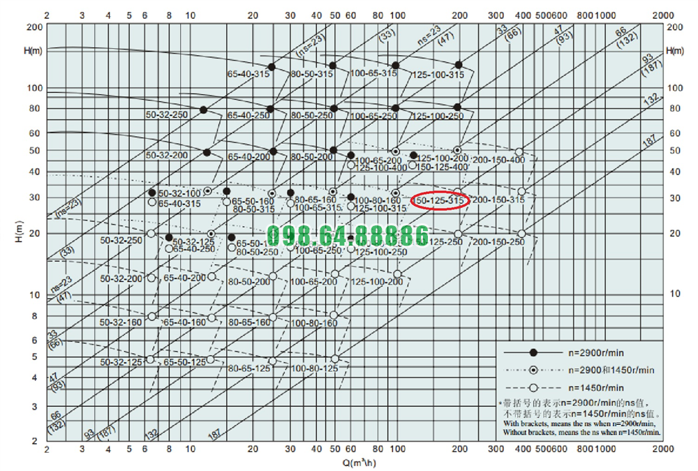 Đường cong hiệu suất của máy bơm nước li tâm trục ngang cánh hở IHK150-125-315