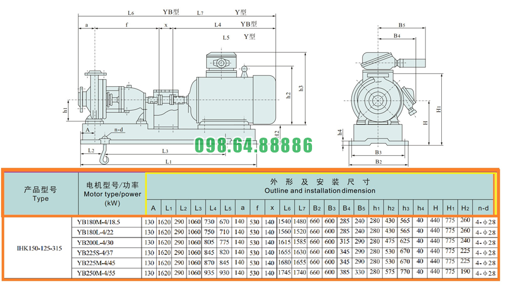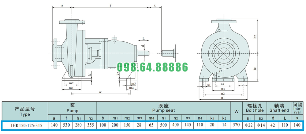 Kích thước của đầu máy bơm nước li tâm trục ngang cánh hở IHK150-125-315