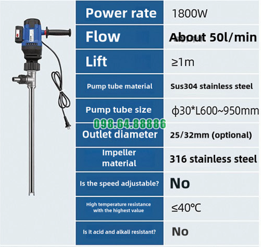 Thông số Máy bơm chất lỏng cắm điện jdt-1800w-30sus304