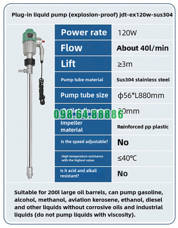 Vẻ ngoài hiện đại và chắc chắn của Bơm chất lỏng cắm điện chống cháy nổ JDT-EX120W-SUS304