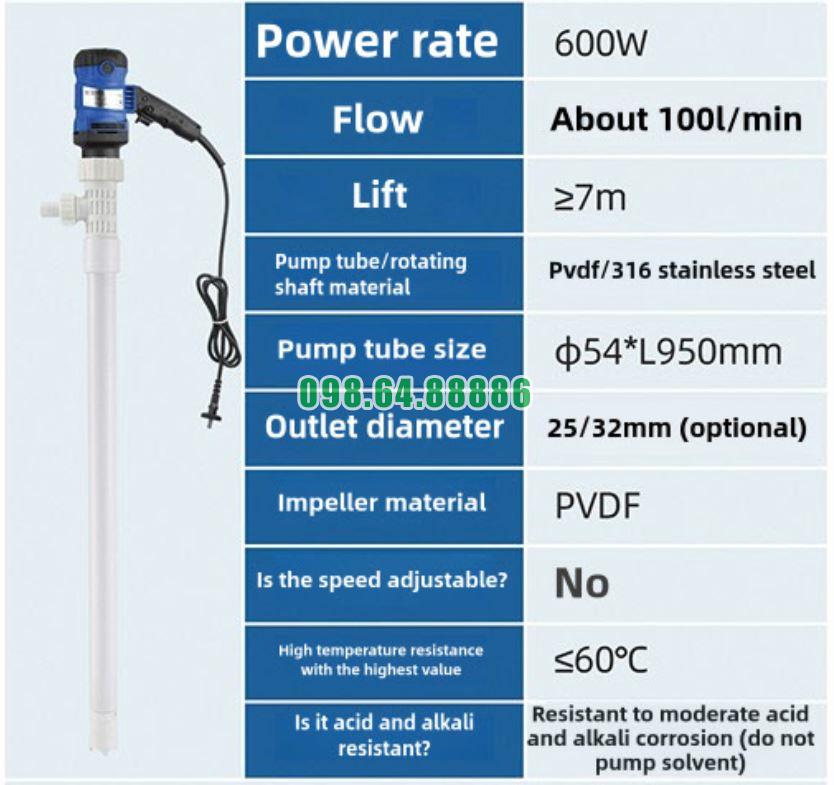 Máy bơm chất lỏng điện cắm nguồn JDT-600W-PVDF